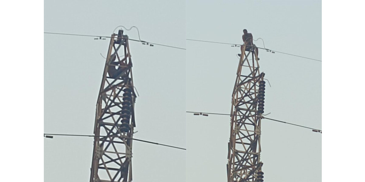 गुणस्तरहीन काम रोक्न माग गर्दै १ लाख ३२ हजार भोल्टको हाइटेन्सनको पोलमा चढे युवक