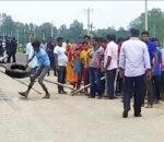 कलेज बसको ठक्करबाट युवकको मृत्यु भएपछि स्थानीयले गरे सडकमा टायर बालेर प्रदर्शन